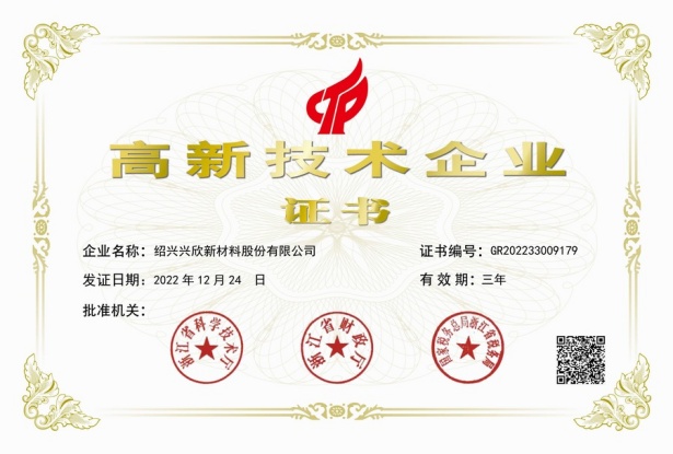 紹興興欣新材料股份有限公司成立于2002年06月27日,占地面積122畝,位于杭州灣上虞經濟技術開發(fā)區(qū)拓展路2號,現有職工200余人,專業(yè)技術人員50余人;博士、碩士研究生30余人組成的一支知識型、專業(yè)化的技術科研團隊。公司面向全球市場,專業(yè)開發(fā)電子化學品、環(huán)保化學品、醫(yī)藥中間體、高分子材料等先進新材料重點領域的省級科技型企業(yè);建有浙江上虞、安徽東至兩個生產基地。目前為“國家高新技術企業(yè)”、浙江省“隱形冠軍”企業(yè)、浙江省專精特新中小企業(yè);建有“省級”研究開發(fā)中心,共建天津大學浙江紹興研究院電子化學品研發(fā)中心。